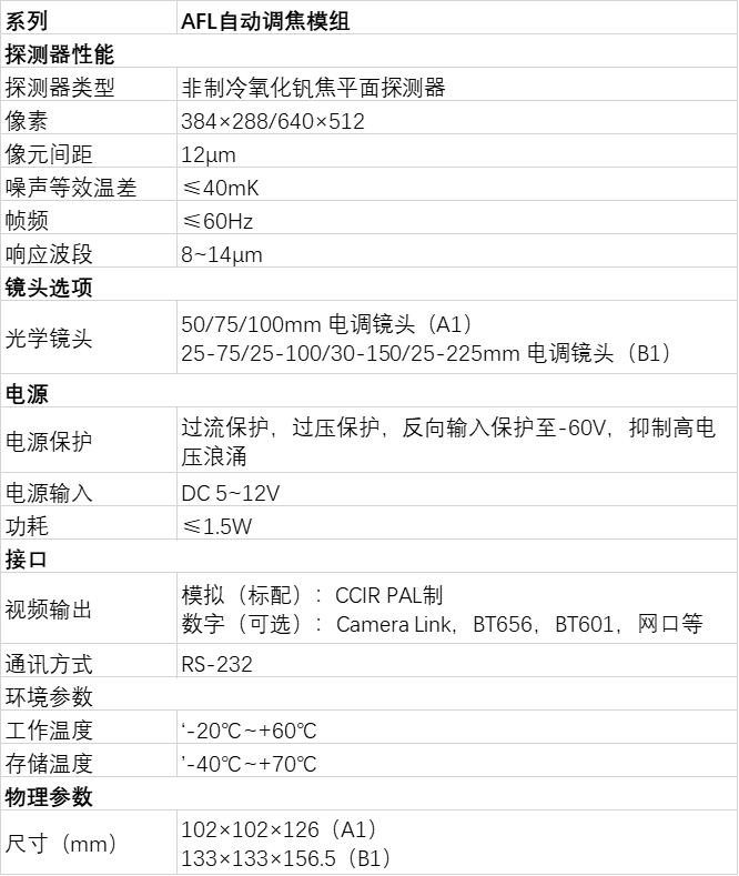 AFL自動調焦模組系列采用384x288/640x512分辨率探測器,具有高靈敏度、高精度、高幀頻、圖像清晰等優點,配備長焦高清電調鏡頭,在各種復雜的應用場景中成像質量優異,可廣泛應用于森林防火、機場空防、高空瞭望等場景。